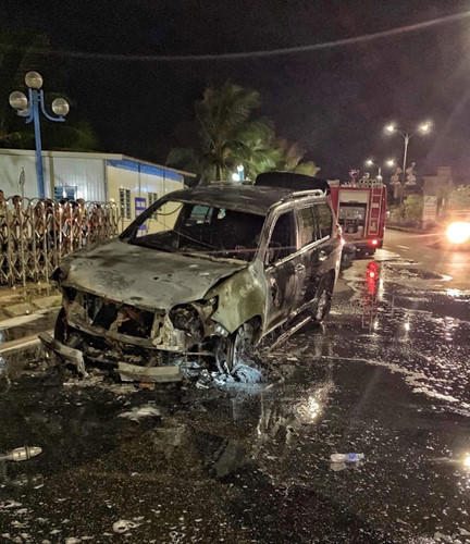 Sau khi ngọn lửa được dập tắt, trơ trụi lại chiếc xe ô tô với phần đầu chuyển màu và biến dạng hoàn toàn, cả chiếc xe bị hư hỏng nặng.