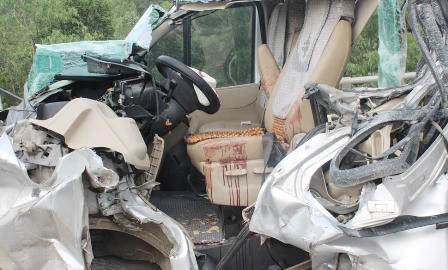 (PLO) - Chiếc xe khách 16 chỗ đâm vào phần đuôi xe tải nổ lốp bất ngờ giảm tốc độ đột ngột, một người tử vong và 8 người khác nhập viện, phần đầu xe khách nát bét.