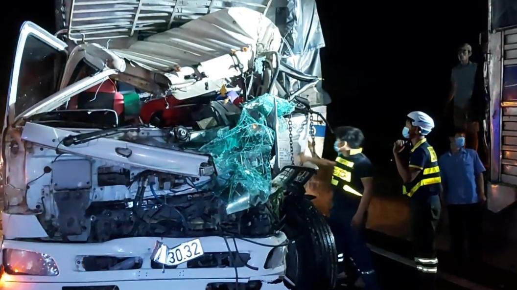 Tại hiện trường xe tải 67C-130.32 bị bẹp dúm biến dạng phần đầu, cá trên xe đổ tràn xuống đường, còn xe tải 60C-452.43 dừng sát dải phân cách ở làn đường số 1, phần bánh trước phía bên tài xế hư hỏng nặng. Phụ xế xe tải 60C-452.43 bị kẹt bên hông xe với dãi phân cách tử vong.