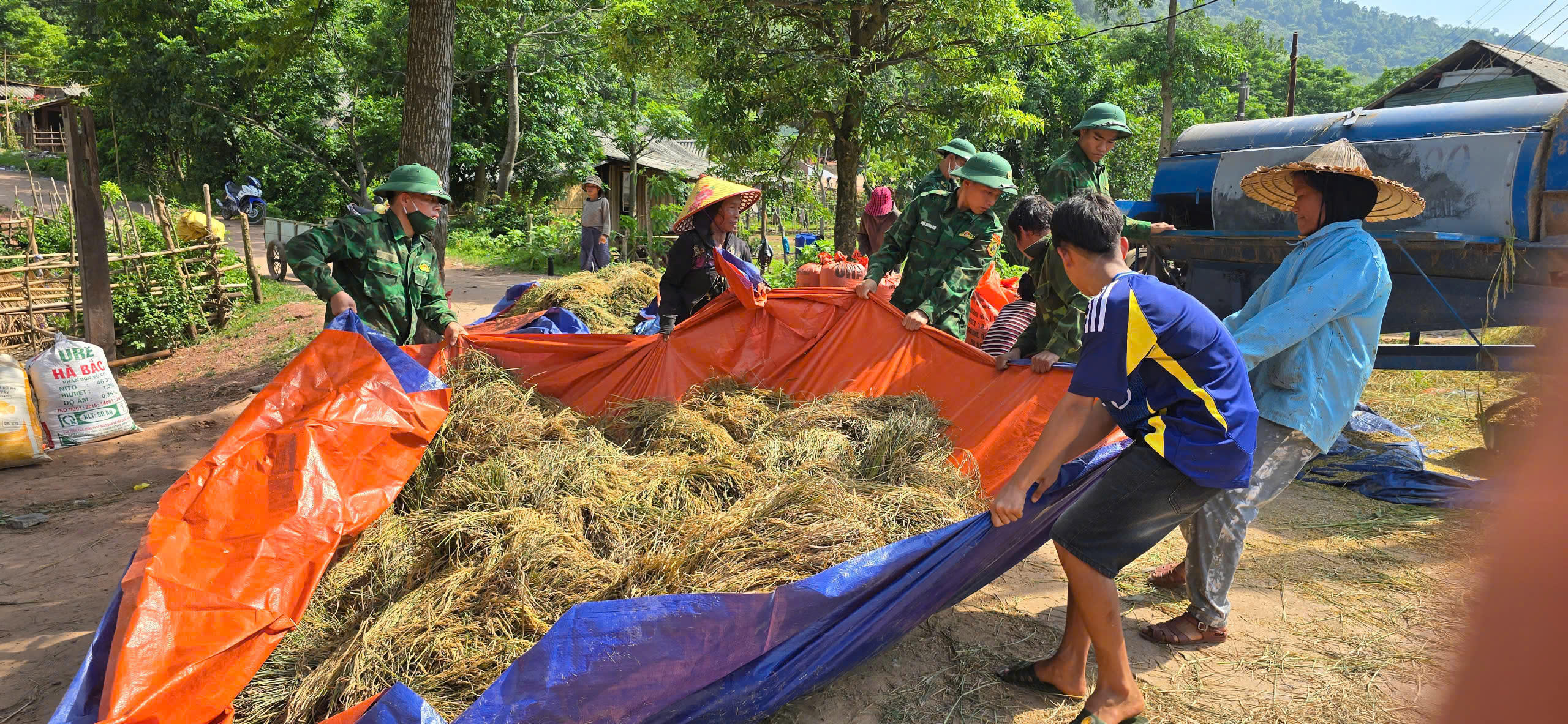 Chung tay giúp bà con dân bản vùng biên thu hoạch lúa vụ mùa. |