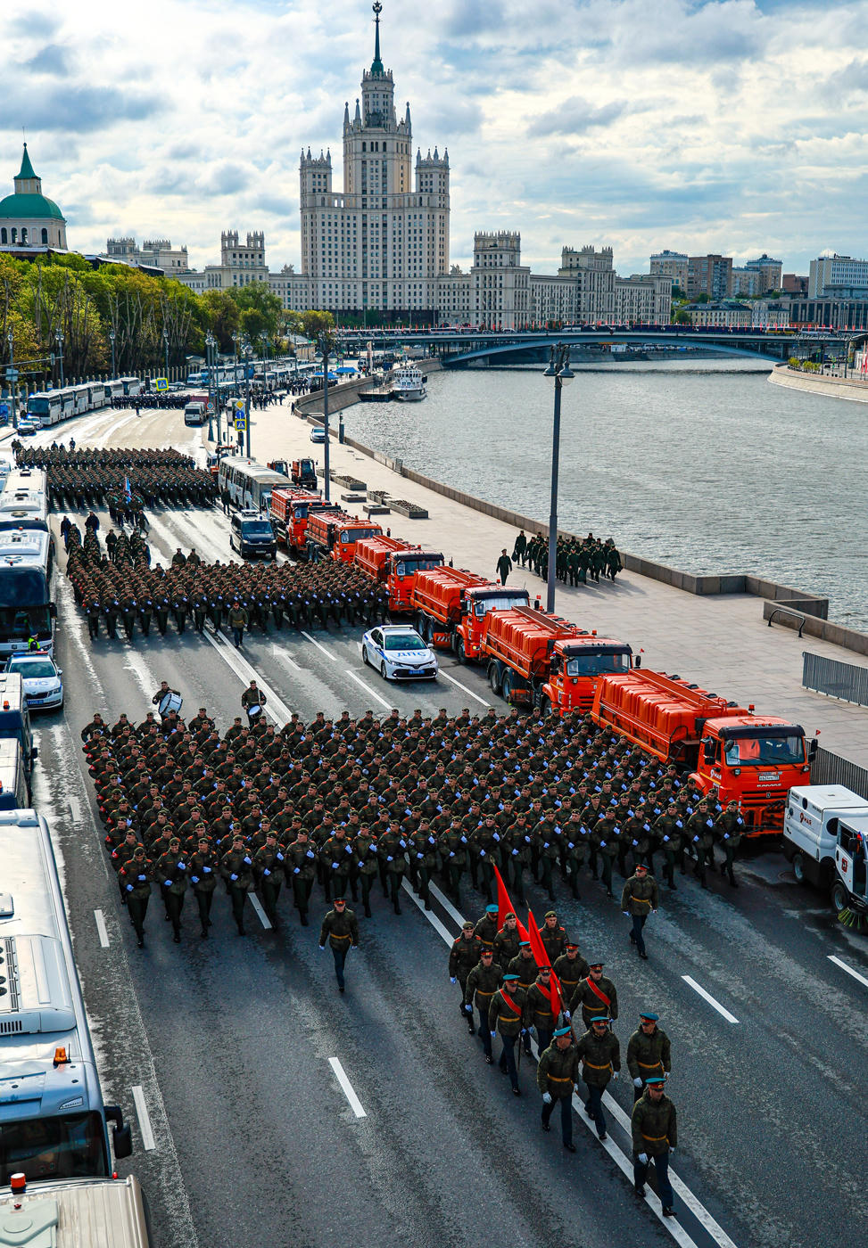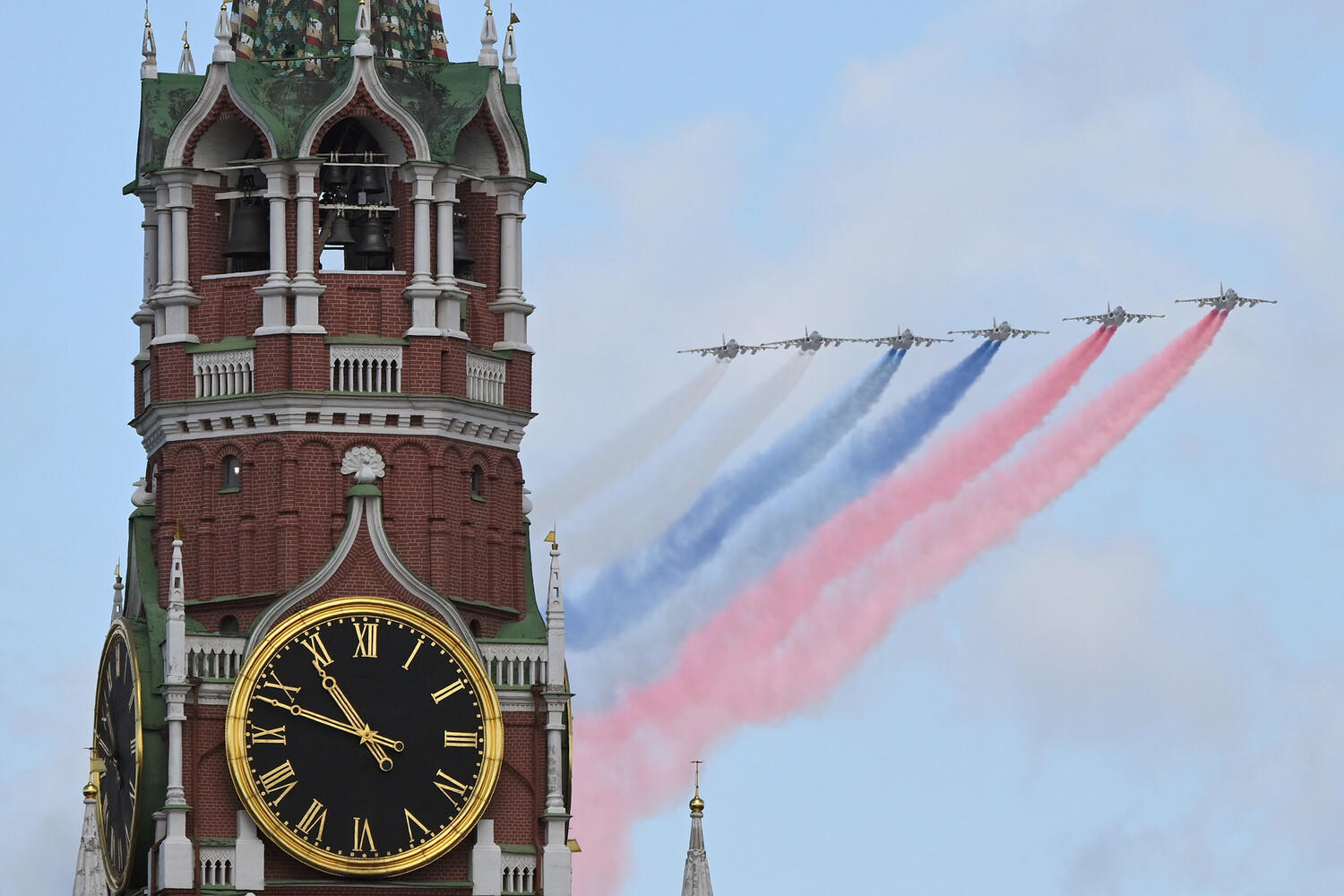 Lễ tổng duyệt kết thúc bằng màn trình diễn của các máy bay chiến đấu với sự tham gia của các phi đội Russkiye Vityazi lái chiến đấu cơ Su-30SM và Strizhi trên máy bay MiG-29, cùng nhóm 6 máy bay tấn công Su-25 phun khói màu quốc kỳ Nga, tạo ra các vệt khói màu quốc kỳ Nga.