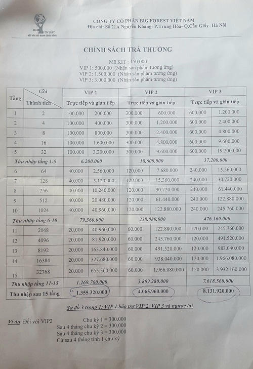 Trước đó, như PLVN đã thông tin công ty Big Forest có trụ sở tại số 22A, Nguyễn Khang, Trung Hòa, Cầu Giấy, Hà Nội. Hiện đang hoạt động kinh doanh các mặt hàng thức phẩm chức năng như Cốm dành cho trẻ em, phân vi sinh… dưới hình thức kinh doanh đa cấp.