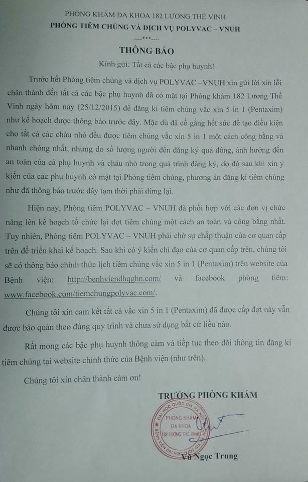 Chiều nay, Phòng tiêm chủng dịch vụ Polyvac đã có văn bản xin lỗi các phụ huynh đã có mặt tại phòng khám 182 Lương Thế Vinh vào sáng ngày 25/12 để đăng ký tiêm chủng vắc xin 5in1 như kế hoạch đã thông báo trước đây.