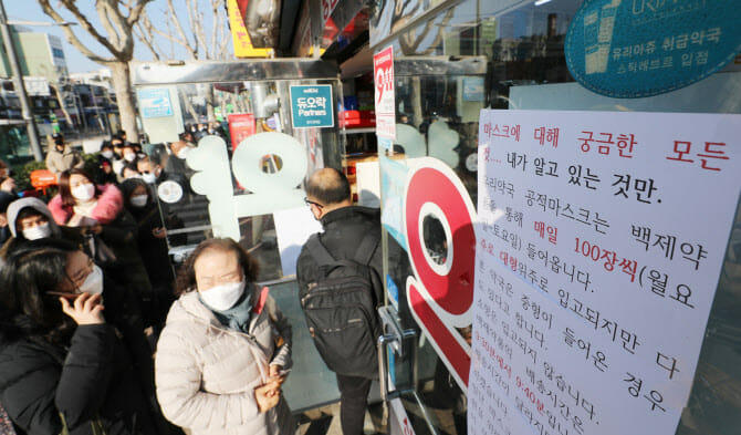 Sáng đầu tiên áp dụng quy định mới, tình trạng chen chúc trước các nhà thuốc ở Seoul phần nào bớt đi mức độ hỗn loạn nhưng lượng người xếp hàng dài chờ mua khẩu trang vẫn đông. Một nhà thuốc lớn ở Jongno, Seoul thông báo sẽ mở bán 150 chiếc khẩu trang bắt đầu từ 10h nhưng người dân đã dậy từ sớm và xếp hàng dài ít nhất 15m. Trong lúc chờ đến lượt, mỗi khách chuẩn bị trước một tay cầm sẵn minh thư, tiền mặt. Chỉ trong vòng 30 phút, 150 chiếc khẩu trang nhà thuốc được phân phối đã bán hết veo. Nhiều người dân cảm thấy vô cùng may mắn và phấn khởi khi mua được khẩu trang nhưng cũng bày tỏ lo lắng không biết phải làm sao khi chỉ được dùng 2 chiếc khẩu trang cho 7 ngày.