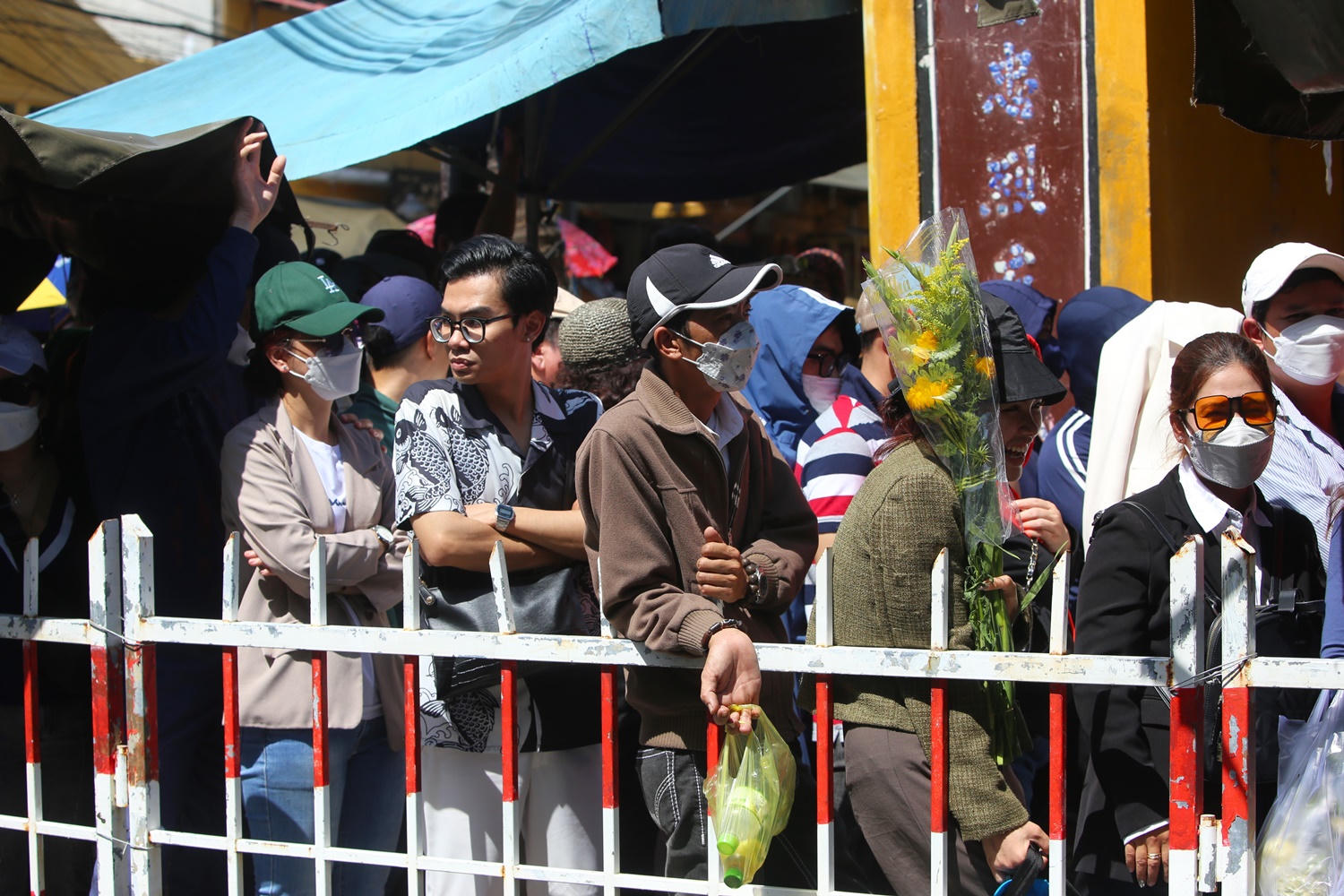 Lực lượng bảo vệ cho người dân xếp thành 2 hàng trên đoạn đường trước Chùa Ông để đảm bảo an ninh trật tự.