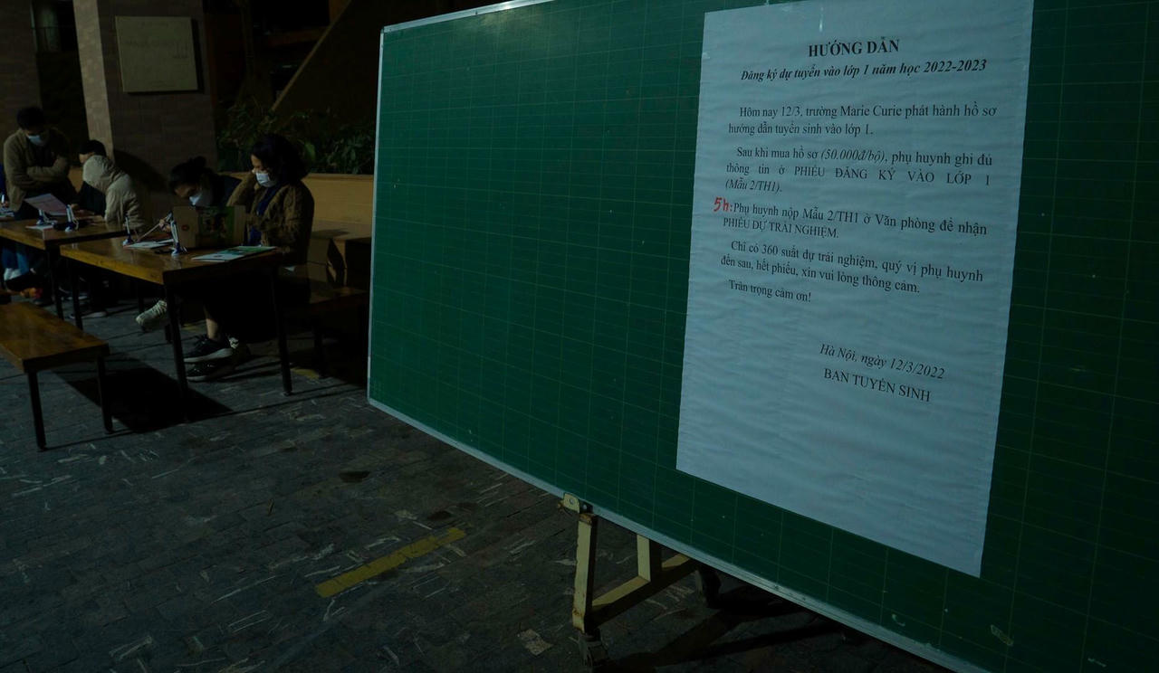 Sau khi mua hồ sơ (50 nghìn đồng/bộ), phụ huynh phải ghi đủ thông tin vào Phiếu đăng ký vào lớp 1. Sau khi điền thông tin xong, các phụ huynh sẽ chờ đến 5h sáng khi Văn phòng trường làm việc để nhận Phiếu dự trải nghiệm cho con.