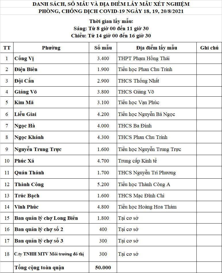 Theo đó, UBND quận Ba Đình cho biết từ ngày 18/8 đến 20/8 sẽ tiến hành mời và lấy mẫu xét nghiệm cho 50.000 trường hợp tại 14 điểm trên địa bàn toàn quận.