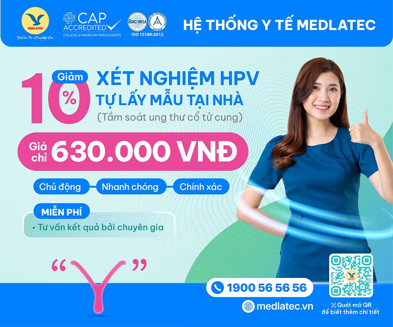 Với mong muốn đồng hành cùng phái đẹp xua tan lo lắng về bệnh ung thư cổ tử cung, từ nay đến hết ngày 31/12/2024, Hệ thống Y tế MEDLATEC triển khai chương trình giảm 10% xét nghiệm HPV tự lấy mẫu tại nhà - tầm soát ung thư cổ tử cung, giá chỉ 630.000 đồng.