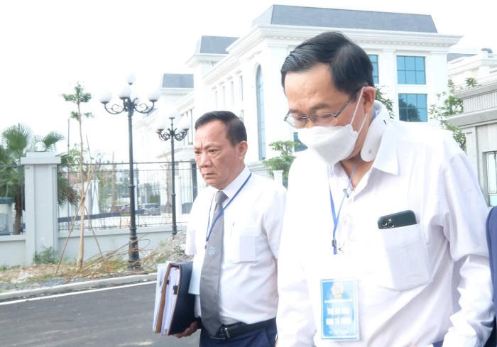 Cựu Thứ trưởng Bộ Y tế Cao Minh Quang (bên phải) đến Tòa. |