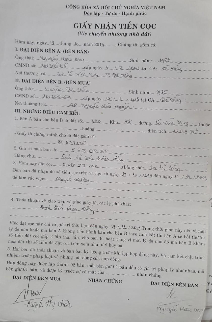 Ngày 24/10/2019, bà Châu đưa hợp đồng đặt cọc với ông Nam cho bà Luận xem. Bà Luận đặt cọc thêm 2 tỷ, hình thức “hợp đồng vay tiền”.