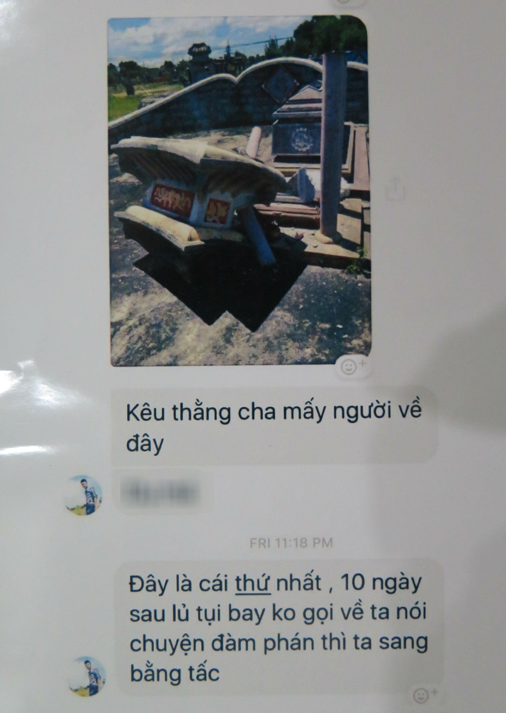 Kèm theo hình ảnh ngôi mộ cha ông Anh bị đập vỡ là tin nhắn: "Đây là cái thứ nhất (ý nói mả thứ nhất bị đập phá-PV), 10 ngày sau, lũ tụi bay không gọi về ta nói chuyện đàm phán thì ta san bằng tất". Ở tin nhắn khác, Ng. nêu nguyên nhân mà anh ta đập mộ ông bà cố như sau: