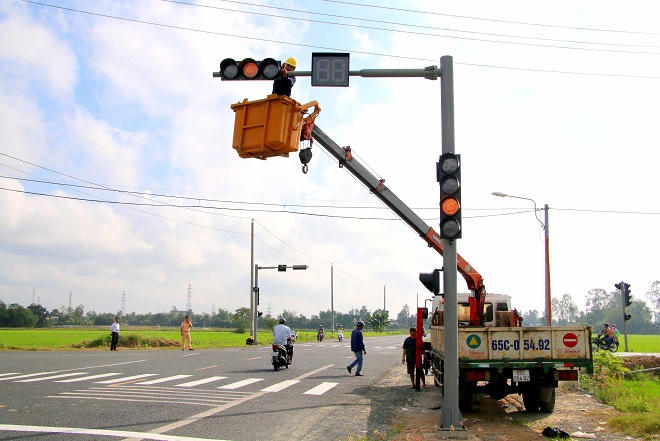 | Công nhân hoàn tất việc lắp đặt đưa vào hoạt động đèn tín hiệu giao thông tại nút giao tuyến tránh Thốt Nốt - Nguyễn Trọng Quyền |