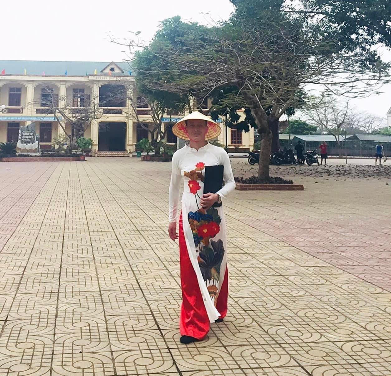 Thầy là Hồ Phan Ngọc, giáo viên Trường THPT Quỳnh Lưu 4, huyện Quỳnh Lưu, Nghệ An, hưởng ứng tuần lễ áo dài và mừng Ngày Quốc tế Phụ nữ 8/3.