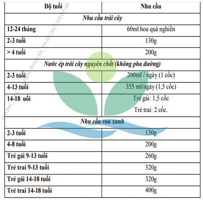 Bảng nhu cầu rau xanh và trái cây của trẻ hàng ngày theo độ tuổi