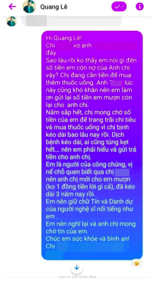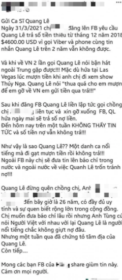 Mạng xã hội mới xôn xao trước thông tin ca sĩ Quang Lê bị tố vay nợ số tiền 4.600 USD (hơn 100 triệu đồng) từ tháng 12/2018 nhưng đến nay vẫn chưa trả. Theo đó, đôi vợ chồng khẳng định đã cho nam ca sĩ mượn tiền, đăng hẳn status yêu cầu anh trả nợ vì nhắn tin mãi nhưng không nhận được hồi âm, thông tin này nhanh chóng khiến người hâm mộ vô cùng hoang mang.