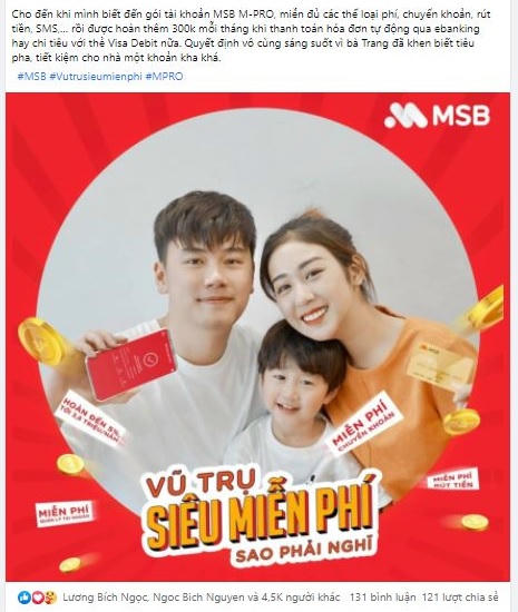 Như một "trợ thủ" đắc lực, gói tài khoản MSB M-Business mở ra cả "Vũ trụ siêu miễn phí" giúp chủ kinh doanh tiết kiệm đến 80 triệu đồng/năm các khoản phí giao dịch (miễn gần 50 loại phí); nhập hàng và chuyển khoản thanh toán siêu tốc với hạn mức tới 16 tỷ đồng/ngày ... Hay khi cần ứng vốn nhanh, "Vũ trụ siêu miễn phí" của M-Business lại như một nhà đầu tư đích thực khi tặng thẻ tín dụng và thấu chi với hạn mức tới 1 tỷ đồng. Trong khi đó, cô chủ kinh doanh Huyền Lizzie thì "Ưng nhất là quảng cáo online vì được hoàn tiền 10%. Mùa dịch này, xem chi phí quảng cáo Huyền cũng bị chóng mặt té xỉu ấy chứ. May quá, bây giờ đã có chiếc 'phao cứu sinh' này, giờ tự tin mà quảng cáo luôn".