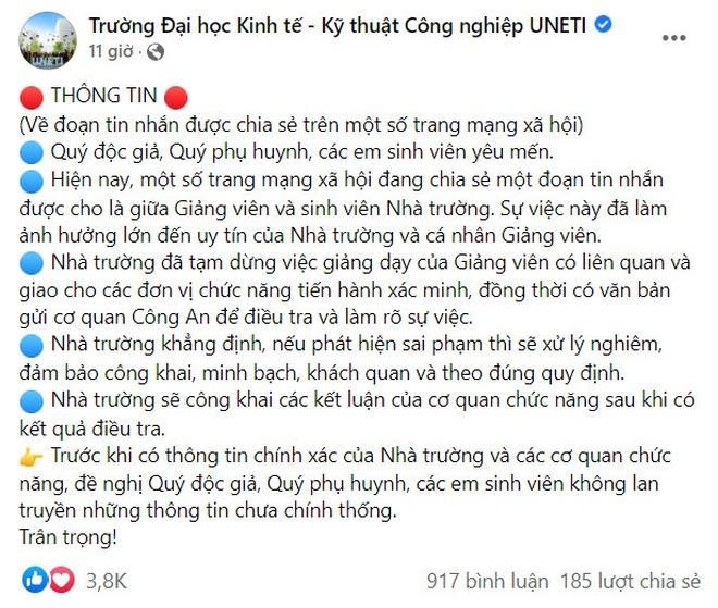 Dù vậy, trường Đại học Kinh tế - Kỹ thuật Công nghiệp đã tạm dừng công tác đối với giảng viên nói trên để phục vụ điều tra, làm rõ thông tin từ chiều ngày 27/10.