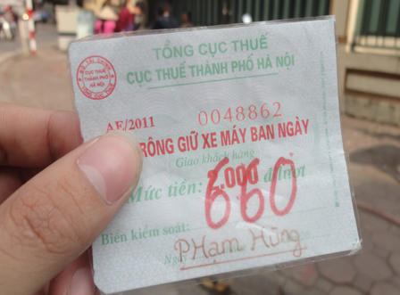 | Vé tại các bãi trông xe tự phát quanh đền Quán Thánh chỉ để ghi số xe, còn mức phí do người trông quy định. |