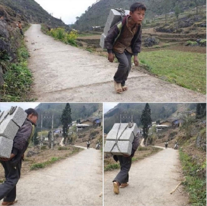 Mới đây, một tài khoản trên mạng xã hội chia sẻ hình ảnh một cậu bé người Mông oằn mình cõng gạch lên bản. Theo tài khoản này chia sẻ quãng đường lên bản khá xa và dốc ngược, xe máy không lên được nên đều phải dùng sức người.
