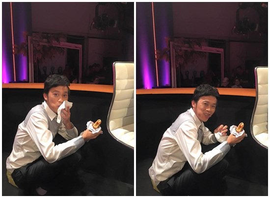Để đáp ứng lịch trình công việc dày đặc, anh không ngại ăn vội bát bún, tô mì bất cứ lúc nào. Thậm chí, chỉ cần một manh chiếu, ‘chân chống chân quỳ’, Hoài Linh vẫn vui vẻ ‘nạp năng lượng’ tiếp tục ‘chiến đấu’.