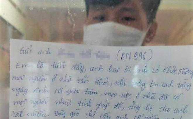 “Gửi anh P.H.T (BN 996). Em là T. Đây. Anh Hai ơi, anh có khỏe không. Mọi người ở nhà vẫn khỏe, vẫn trông tin anh từng ngày. Anh cứ yên tâm, mọi việc ở nhà đã có mọi người nhiệt tình giúp đỡ, ủng hộ cho anh rất nhiều. Bây giờ chỉ cần anh cố gắng mạnh mẽ lên, ý chí chiến thắng vượt qua giai đoạn khó khăn này. Anh hãy kiên cường lên...”, cậu em trai viết những dòng nhắn gửi trên tấm bìa carton gửi đến cho anh mình.