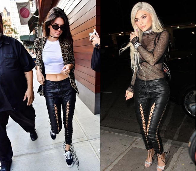 Kendall và Kylie Jenner cũng thể hiện sự thích thú của mình với chiếc quần phá cách. Kendall thì lựa chọn áo phông trắng croptop cùng với áo khoác họa tiết da báo và giày thể thao thật năng động. Còn Kylie Jenner thì chọn giày cao gót cùng với áo ren xuyên thấu sexy.