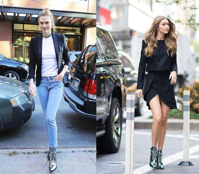 Ankle bốt, Karlie Kloss và Gigi Hadi cùng lăng xê đôi bốt ánh kim buộc dây, thiết kế mới của Stuart Wetizman.