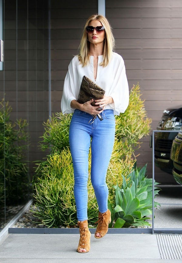 Rosie Huntington-Whiteley khoe vóc dáng cùng áo sơ mi voan trắng, skinny jean sáng màu và ankle boot da lộn cao gót buộc dây ấn tượng.