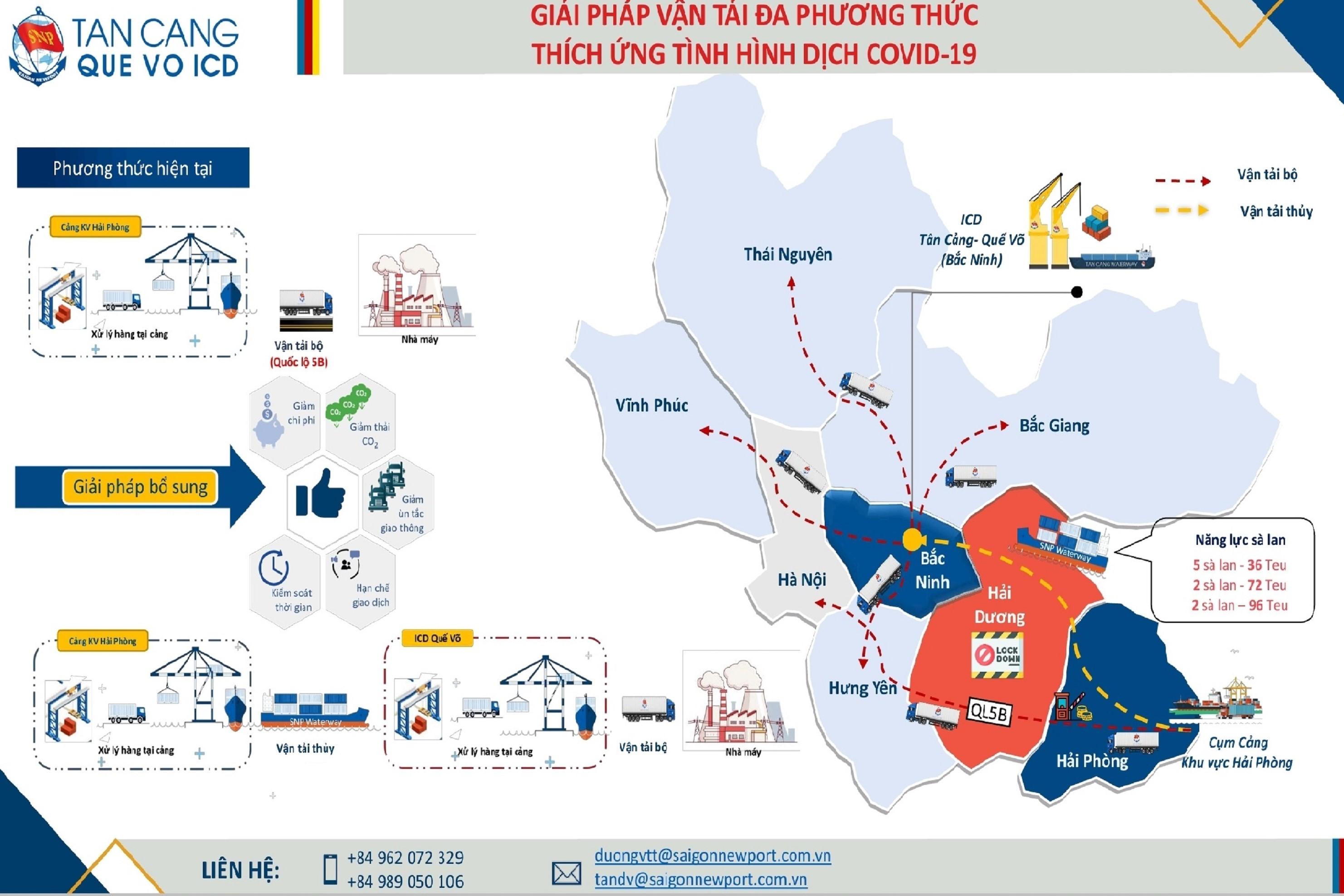 Là nhà khai thác cảng và dịch vụ logistics hàng đầu Việt Nam, Tổng công ty Tân Cảng Sài Gòn (TCT TCSG) đã triển khai thành công giải pháp vận tải đa phương thức (thủy – bộ kết hợp) tại khu vực phía Nam – với sự tham gia tích cực của các đơn vị trong hệ thống. Áp dụng hiệu quả của phương thức trên trong việc đảm bảo kết nối chuỗi cung ứng tại khu vực Phía Bắc, TCT TCSG đã phát triển Giải pháp vận tải đa phương thức (thủy – bộ kết hợp) để vận chuyển hàng hóa thông suốt tuyến Bắc Ninh - Hải Phòng, đáp ứng nhu cầu sản xuất. Giải pháp này được triển khai kết hợp đồng bộ giữa Vận Tải Thủy Tân Cảng, cùng các đơn vị vận tải bộ với điểm trung chuyển tại ICD Tân Cảng - Quế Võ (Bắc Ninh).