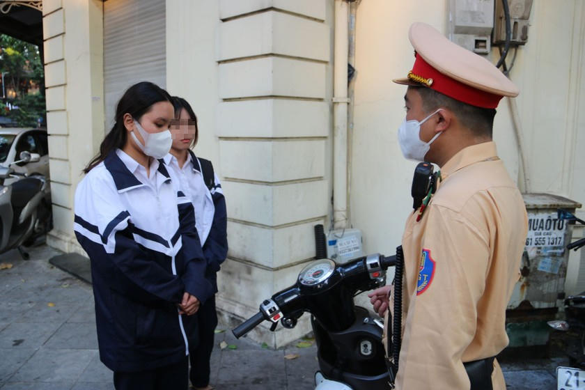 Tại ngã tư Ngô Quyền - Hai Bà Trưng, phường Hàng Bài, quận Hoàn Kiếm (Hà Nội), sáng nay, tổ công tác Cảnh sát giao thông số 1 đã dừng một số phương tiện vi phạm. Đơn cử, chị L.V.L. (sinh năm 1981 ở quận Hoàn Kiếm) bị dừng xe khi chở con nhỏ trên xe máy phóng nhanh qua ngã tư nhưng cả 2 đều không đội mũ bảo hiểm. Theo lời chị L, do vội chở con đi học về để tiếp tục đưa con tới một lớp học thêm khác nên chị không kịp mang theo mũ bảo hiểm.