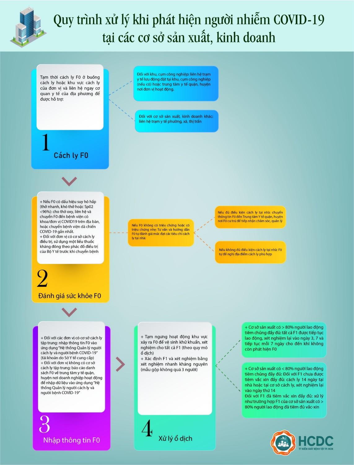 (PLVN) - Khi phát hiện người nhiễm COVID-19, các đơn vị cần thực hiện quy trình 4 bước theo Hướng dẫn tạm thời Phương án phòng, chống dịch COVID-19 tại các cơ sở sản xuất, kinh doanh, khu công nghiệp (Hướng dẫn) do Sở Y tế TP HCM mới ban hành.