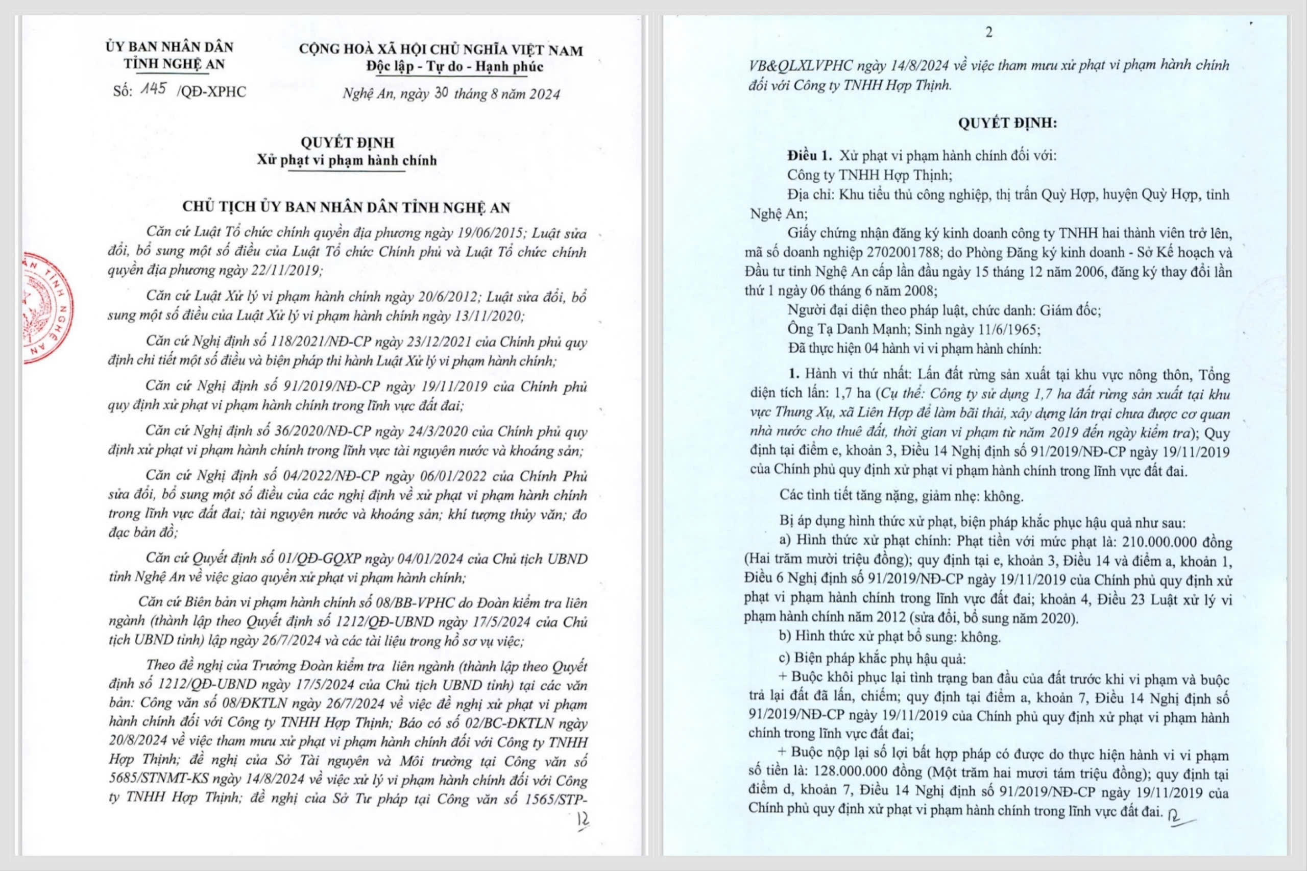 Với những vi phạm nêu trên, Công ty TNHH Hợp Thịnh bị UBND tỉnh Nghệ An xử phạt tổng số tiền 355 triệu đồng.