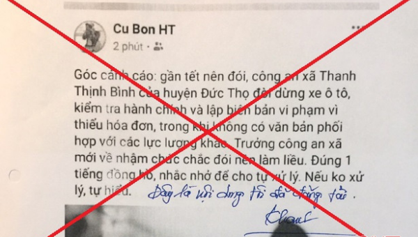Trước đó, vào ngày 28/12, tài khoản Facebook “Cu Bon HT” và tài khoản Zalo “Cu Bon HT” có đăng nội dung “Góc cảnh cáo: gần tết nên đói, Công an xã Thanh Bình Thịnh của huyện Đức Thọ đòi dừng xe ô tô, kiểm tra hành chính và lập biên bản vi phạm vì thiếu hóa đơn, trong khi không có văn bản phối hợp với các lực lượng khác. Trưởng Công an xã mới về nhậm chức chắc đói nên làm liều. Đúng 1 tiếng đồng hồ, nhắc nhở để cho tự xử lý. Nếu không xử lý, tự hiểu”.