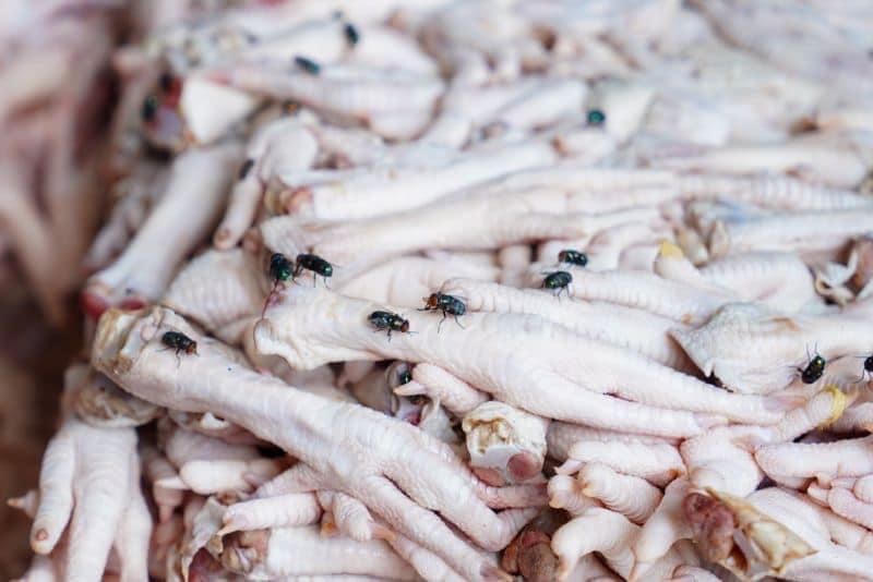 Hành vi thứ ba là khu vực sản xuất, nguyên liệu thực phẩm có côn trùng, động vật gây hại xâm nhập; cụ thể: một số chân gà nguyên liệu có ruồi, nhặng đậu.