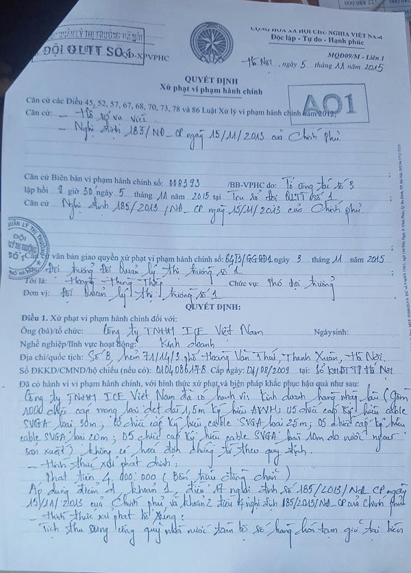Ngày 5/11, đội QLTT số 1 (Chi cục QLTT Hà Nội ) đã ra quyết định xử phạt vi phạm hành chính đối với công ty TNHH ICE Việt Nam với hành vi : Kinh doanh hàng nhập lậu, bao gồm 100 chiếc cáp mạng loại dẹt dài 1,5m ký hiệu AWH; 5 chiếc cáp ký hiệu Cable SVGA loại 30m; 3 chiếc cáp ký hiệu Cable SVGA loại 25m; 5 chiếc cáp ký hiệu Cable SVGA loại 20m; 5 chiếc cáp ký hiệu Cable SVGA loại 10m do nước ngoài sản xuất, không có hóa đơn chứng từ theo quy định. Với hình thức xử phạt hành chính 4 triệu đồng.
