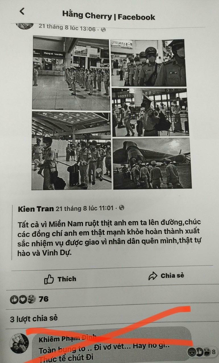 Trước đó, vào khoảng 19h ngày 21/8, Phạm Đình Khiêm đã đăng nhập tài khoàn facebook cá nhân mang tên “Khiêm Phạm Đình”, đọc được bài viết do tài khoản “Hằng Cherry” chia sẻ từ tài khoản “Kien Tran” với nội dung: “Tất cả vì miền Nam ruột thịt anh em ta lên đường, chúc các đồng chí anh em thật mạnh khỏe hoàn thành xuất sắc nhiệm vụ được giao vì nhân dân quên mình, thật tự hào và vinh dự” kèm theo 5 ảnh chụp lực lượng Cảnh sát giao thông tại sân bay. Khiêm đã đăng tải công khai bình luận bài viết trên với nội dung: “Toàn bụng to..Đi vơ vét...Hay ho gì... Thực tế chút đi”.