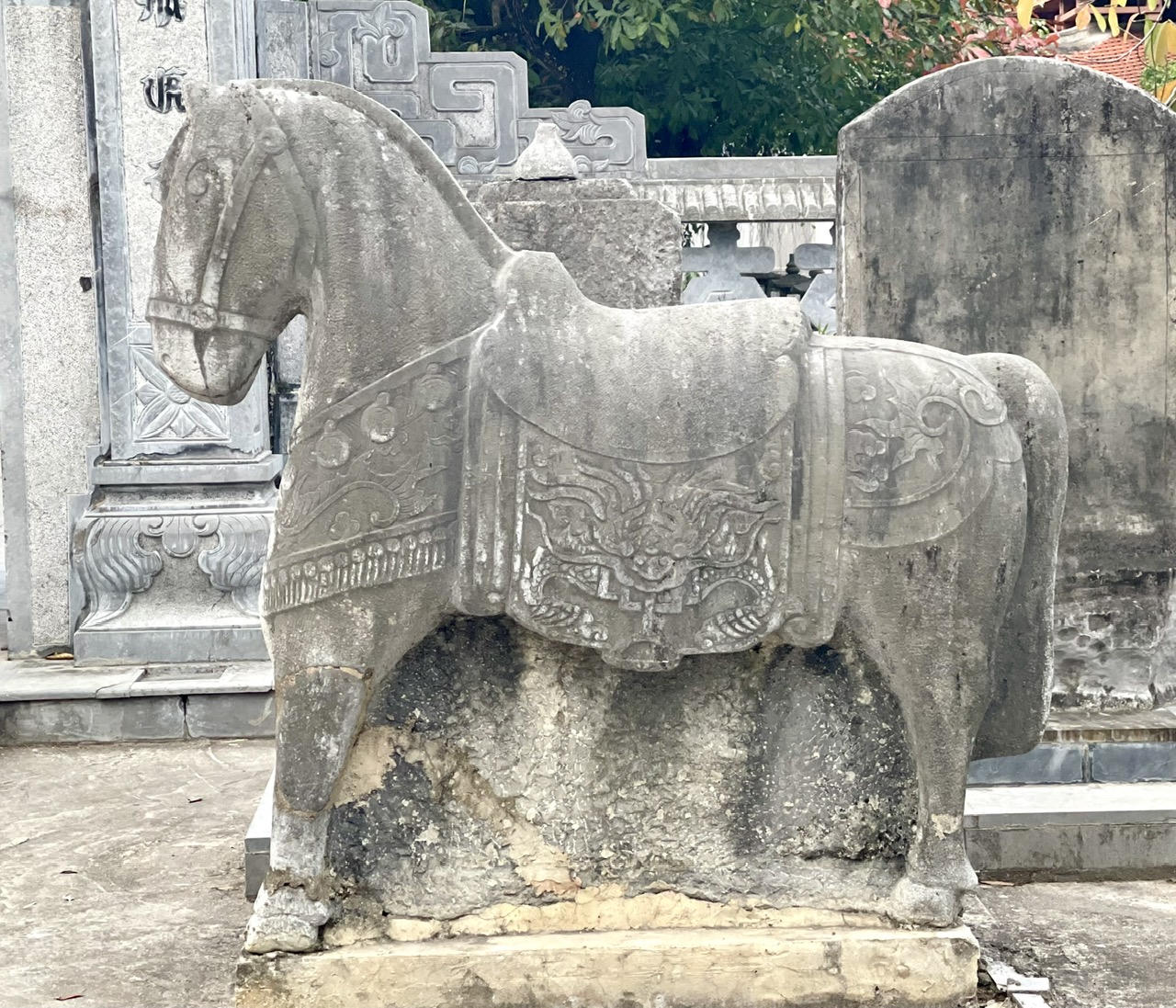 Hai ngựa đá được chạm khắc đúng dáng hình ngựa chiến, sẵn sàng xung trận, đầu ngựa có đủ mắt, mũi, tai, đuôi ngựa thõng xuống, yếm ngựa vắt trên lưng thả xuống hai bên được chạm khắc họa tiết, hoa văn cầu kỳ. Dù trải qua khoảng 100 năm, mưa nắng của đất trời cũng không làm đôi ngựa đá mất đi dáng vẻ hiên ngang.