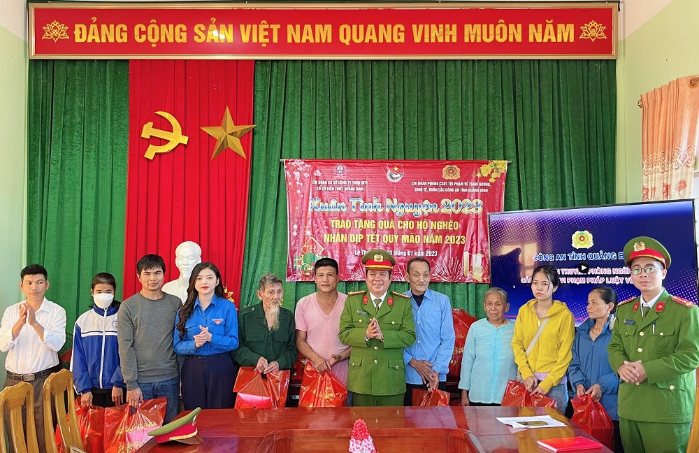 Năm nay, Chi đoàn Phòng Cảnh sát ĐTTP về tham nhũng, kinh tế, buôn lậu (PC03) Công an tỉnh Quảng Bình cùng Hội phụ nữ CSND phối hợp với Chi đoàn Công ty TNHH MTV Xổ số kiến thiết Quảng Bình, Đoàn xã Hưng Thủy tổ chức Chương trình thiện nguyện trực tiếp trao tặng 30 suất quà với tổng giá trị khoảng 30 triệu đồng cho bà con nhân dân có hoàn cảnh đặc biệt khó khăn trên địa bàn xã Hưng Thủy, huyện Lệ Thủy.