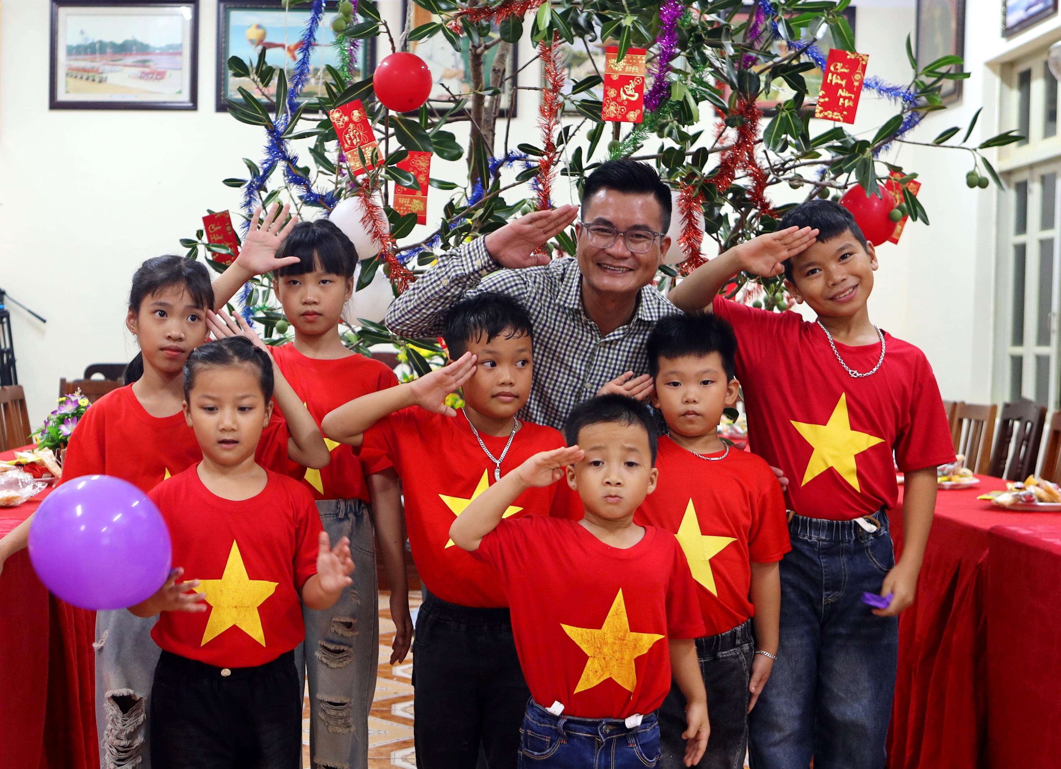 Tác giả bài viết chụp ảnh cùng thiếu nhi đảo Song Tử Tây trong đêm văn nghệ chào Xuân mới. Ảnh: Hoàng Tuấn |