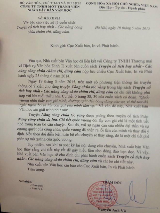 Tuy nhiên, ngay sau khi rà soát kỹ lại nội dung câu chuyện, NXB Văn học khẳng định: “Chi tiết này rất dễ gây hiểu lầm cho đông đảo bạn đọc. Vì vậy, NXB Văn học sẽ cho đình chỉ phát hành cuốn sách Truyện cổ tích hay nhất – Các nàng công chúa chăm chỉ, dũng cảm và cắt bỏ chi tiết này”.
