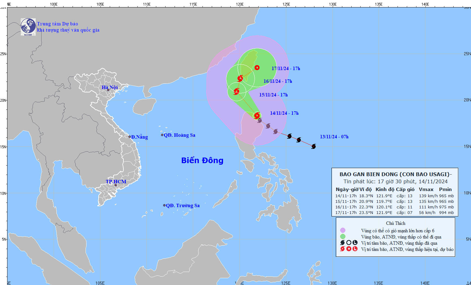 Trung tâm dự báo KTTV Quốc gia dự báo trong 24 giờ tới, bão USAGI di chuyển theo hướng Tây Bắc, với tốc độ khoảng 15km/h, đi vào phía Đông Bắc Biển Đông. Đến 16h ngày 15/11, vị trí tâm bão ở trên vùng biển phía Đông Bắc Biển Đông. Sức gió mạnh nhất vùng gần tâm bão mạnh cấp 13, giật cấp 16