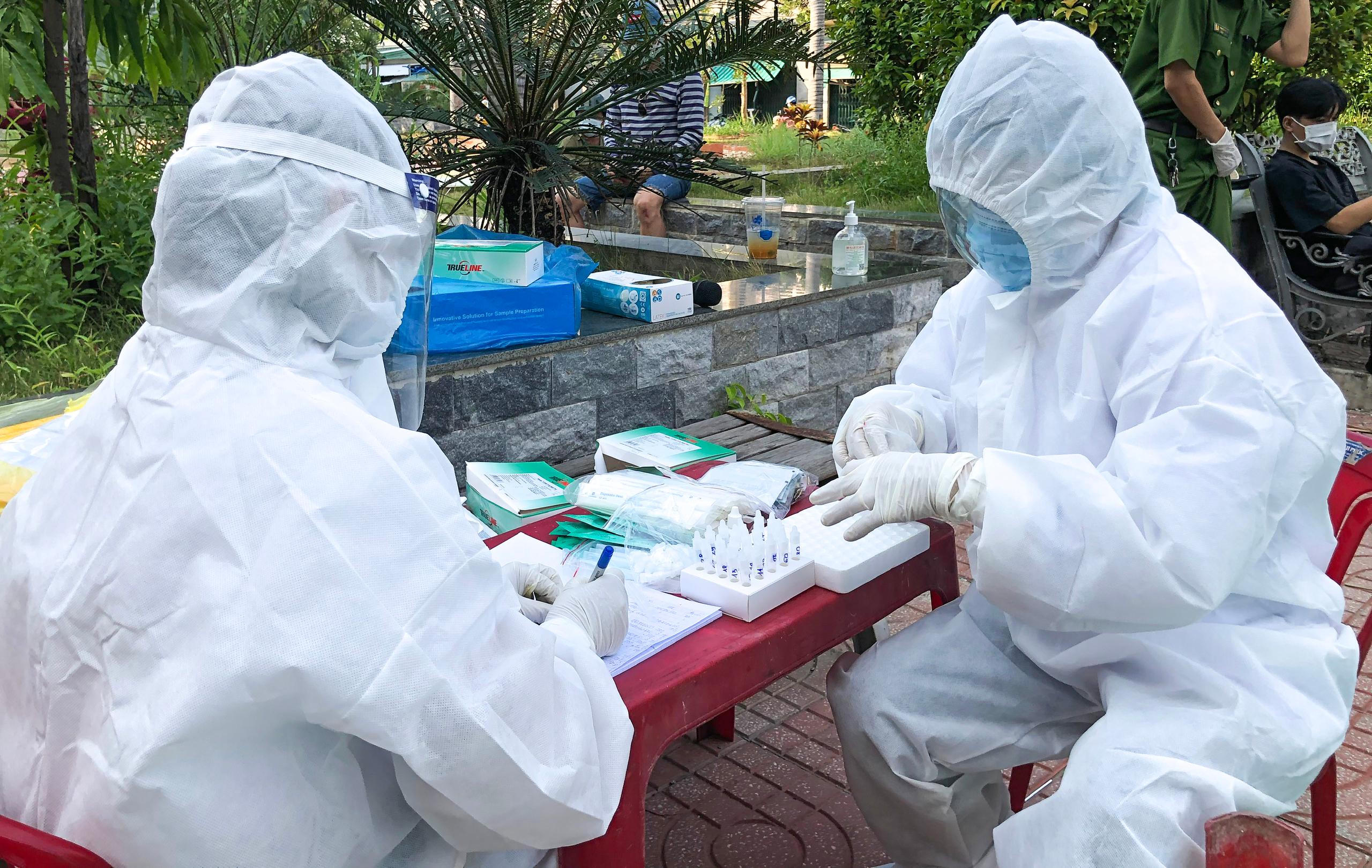 Nhân viên y tế đang lấy mẫu xét nghiệm toàn bộ F1 liên quan đến tiệm áo cưới Trường Sơn, thuộc thị trấn Châu Ổ, huyện Bình Sơn, tỉnh Quảng Ngãi. |