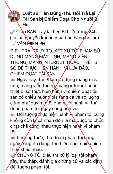 Công an Hà Nội thông tin, hiện nay trên mạng xã hội Facebook xuất hiện các tài khoản giả danh Luật sư đăng bài hỗ trợ thu hồi tiền lừa đảo. Nhiều người bị lừa đảo thay vì ra cơ quan Công an trình báo sự việc đã liên hệ các tài khoản giả danh Luật sư với mong muốn được thu hồi tiền lừa đảo.