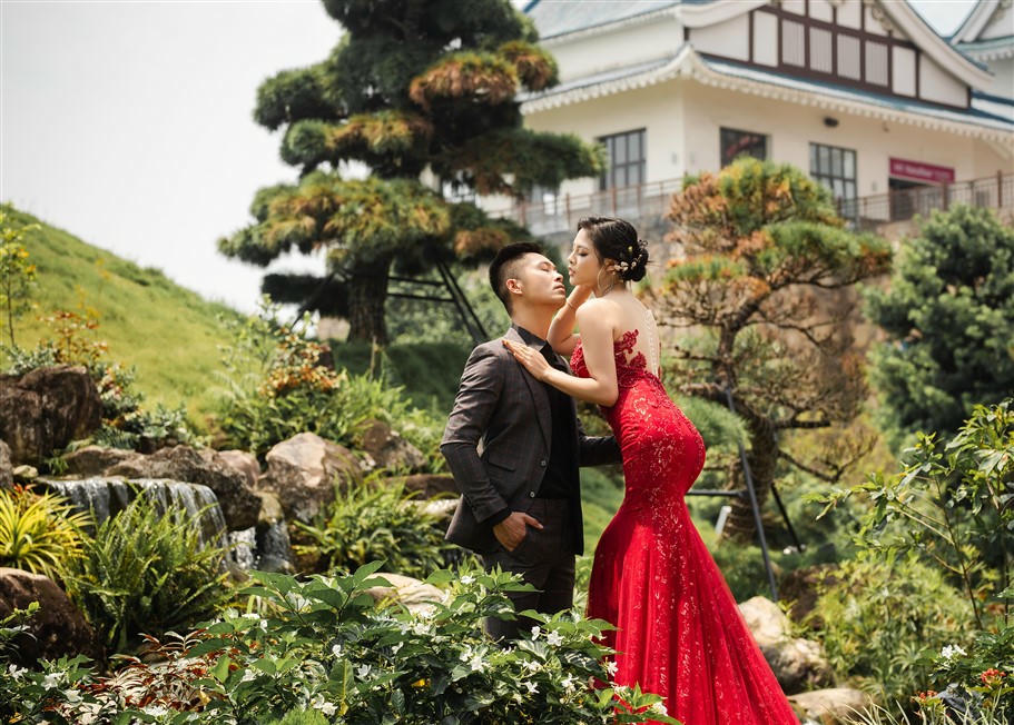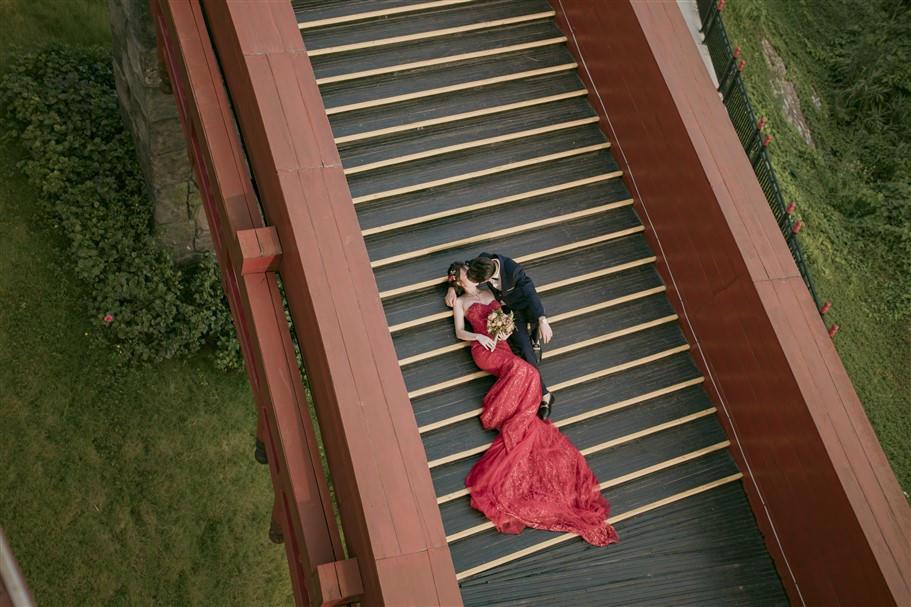 Sắc đỏ của cây cầu Koi khiến nó như thể sinh ra để trở thành phông nền hoàn hảo cho những chiếc váy cưới trắng tinh khôi của cô dâu và bộ vest đen lịch lãm của chú rể.