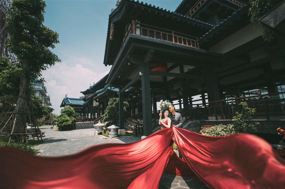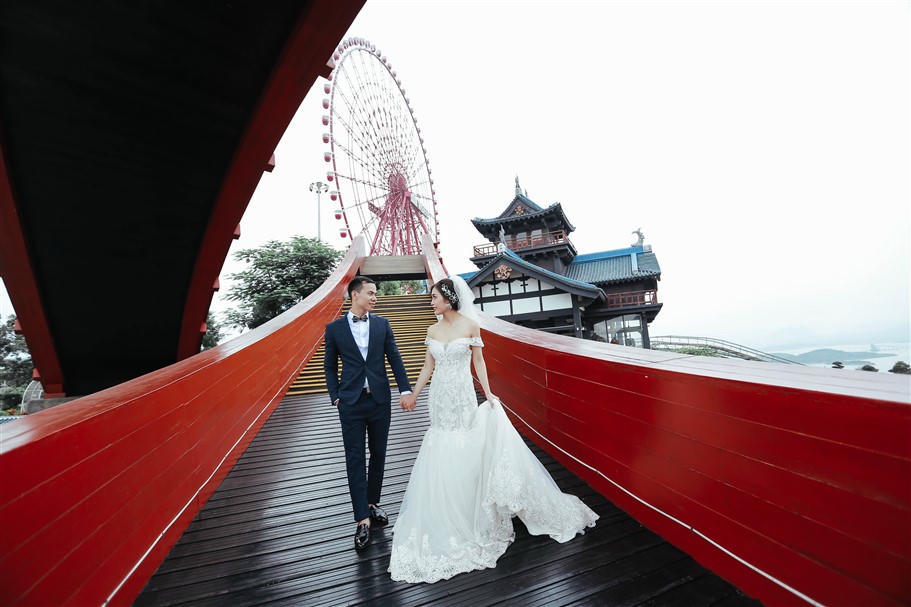 Mỹ Uyên (24 tuổi) chia sẻ: “Mình và anh Linh đã từng đến Sun World Halong Complex vui chơi tham quan. Cả hai đều rất thích thú và ấn tượng với kiến trúc Á Đông đặc trưng được mô phỏng tại công viên. Hai đứa đã quyết định khi chụp hình cưới sẽ đến đây để có những bức hình độc đáo, khác biệt.”