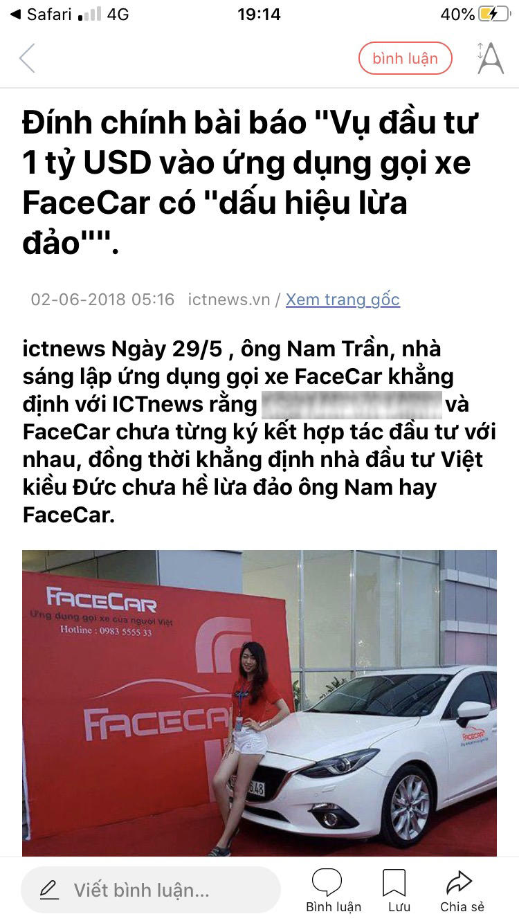 Và ngay sau bài viết “Vụ đầu tư 1 tỷ USD vào ứng dụng gọi xe FaceCar có dấu hiệu lừa đảo", làm ảnh hưởng nghiêm trọng đến danh dự và uy tín của nhà đầu tư Đức, phía ICTNews đã đăng bài đính chính với nội dung “ông Nam Trần, nhà sáng lập ứng dụng gọi xe FaceCar khẳng định với ICTnews rằng nhà đầu tư Đức và FaceCar chưa từng ký kết hợp tác đầu tư với nhau, đồng thời khẳng định nhà đầu tư Đức chưa hề lừa đảo ông Nam hay FaceCar”.