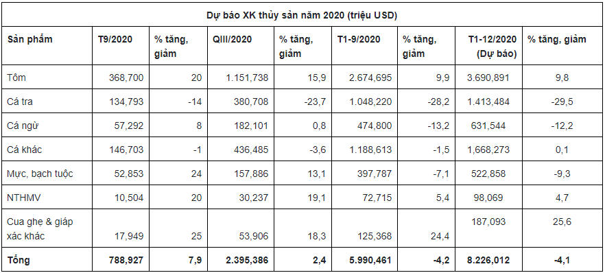 Dự báo XK thủy sản của Việt Nam 3 tháng cuối năm sẽ đạt khoảng 2,3 tỷ USD, giảm nhẹ 2% so với cùng kỳ năm ngoái, trong đó tôm tăng 9% đạt 1,1 tỷ USD, cá tra giảm 31% đạt 365 triệu USD, các mặt hàng hải sản đạt khoảng 854 triệu USD, tăng 7,5% với cùng kỳ năm 2019.