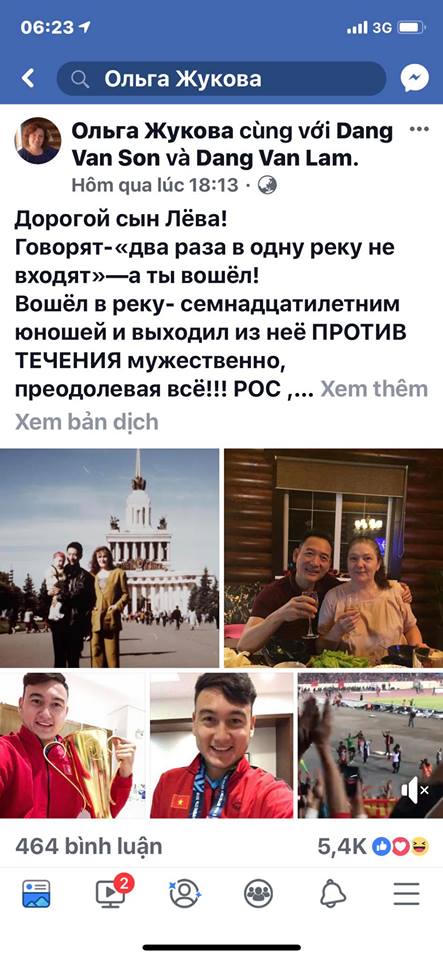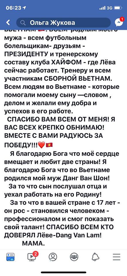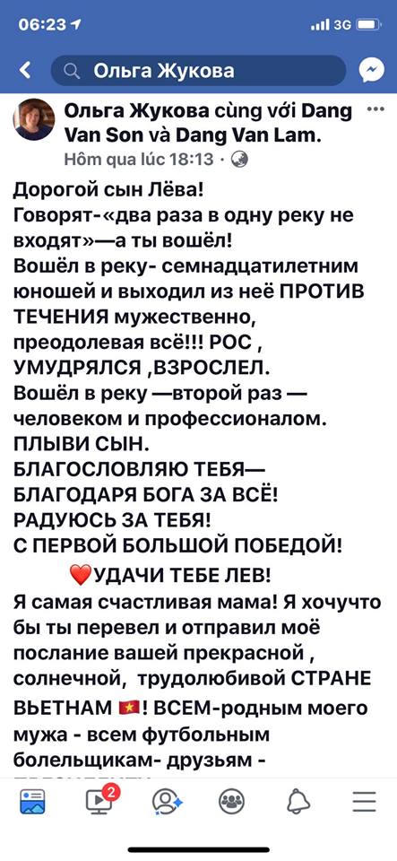 Bức thư cảm động do bà Olga Zhukova viết trên facebook cá nhân bằng tiếng Nga, sau ngày chiến thắng của đội tuyển Việt Nam tại AFF Suzuki Cup 2018, gửi con trai là thủ thành Đặng Văn Lâm, kèm những bức ảnh về gia đình và ảnh Văn Lâm cùng chiếc Cup vàng, đang nhận được rất nhiều like và lượt chia sẻ.