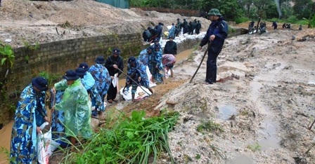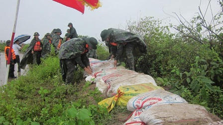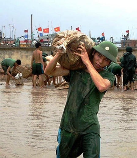 | Cán bộ, chiến sĩ Trung đoàn 50 (Bộ CHQS TP Hải Phòng) dầm mình trong mưa bão giúp dân đắp đập ngăn triều cường. |