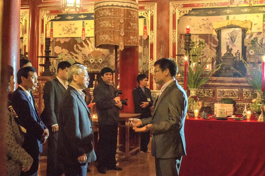 Sau đó, Tổng Bí thư Nguyễn Phú Trọng và đoàn đã đến dâng hương các bậc tiền nhân và nghe giới thiệu về công trình Thế Tổ miếu. Tại đây, Tổng Bí thư Nguyễn Phú Trọng đã căn dặn đội ngũ những người làm công tác bảo tồn di sản văn hóa Cố đô cần phải không ngừng học tập phấn đấu để nâng cao trình độ kiến thức, bồi đắp tình yêu, sự tâm huyết đối với các di sản vô giá của dân tộc.